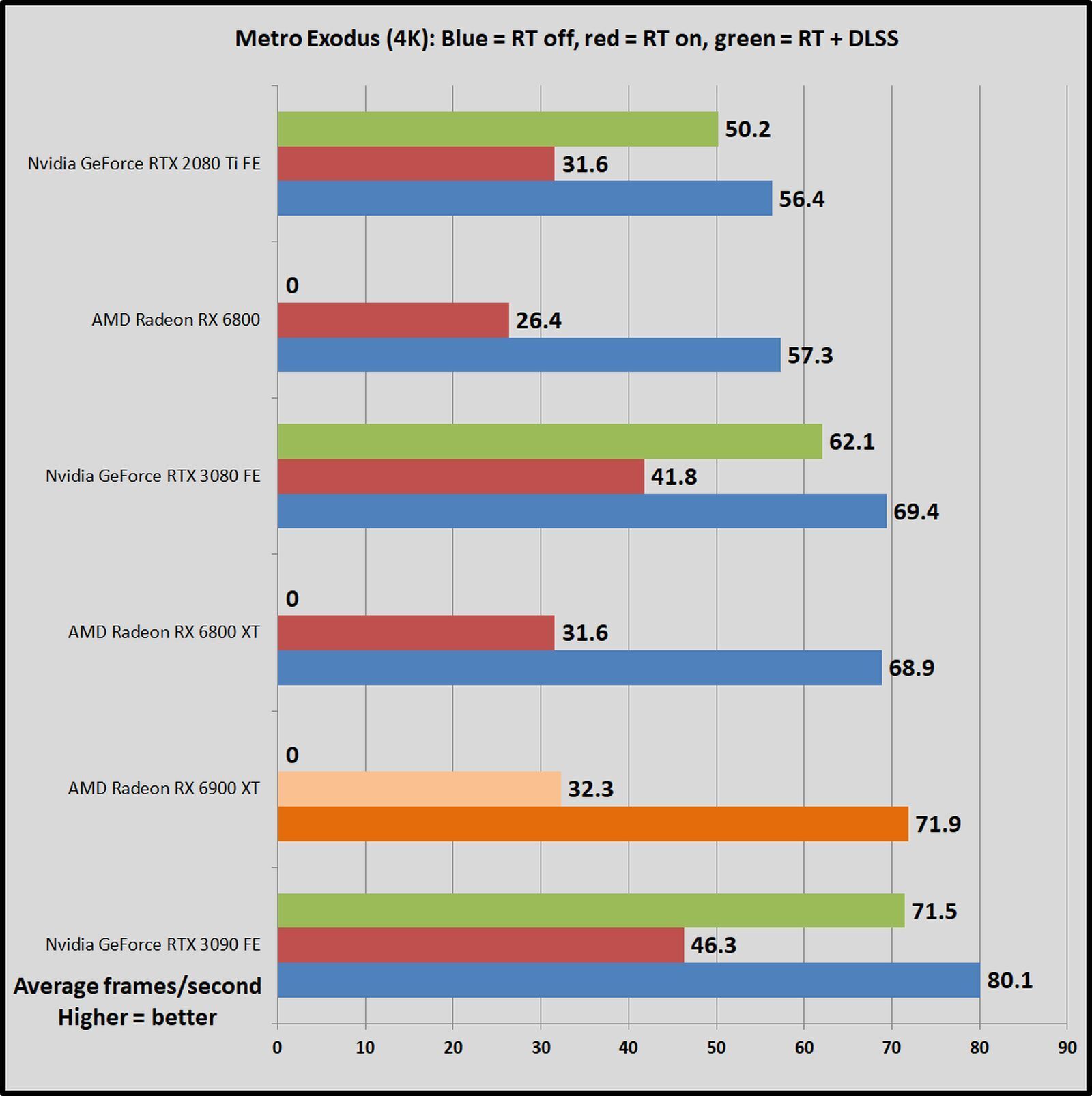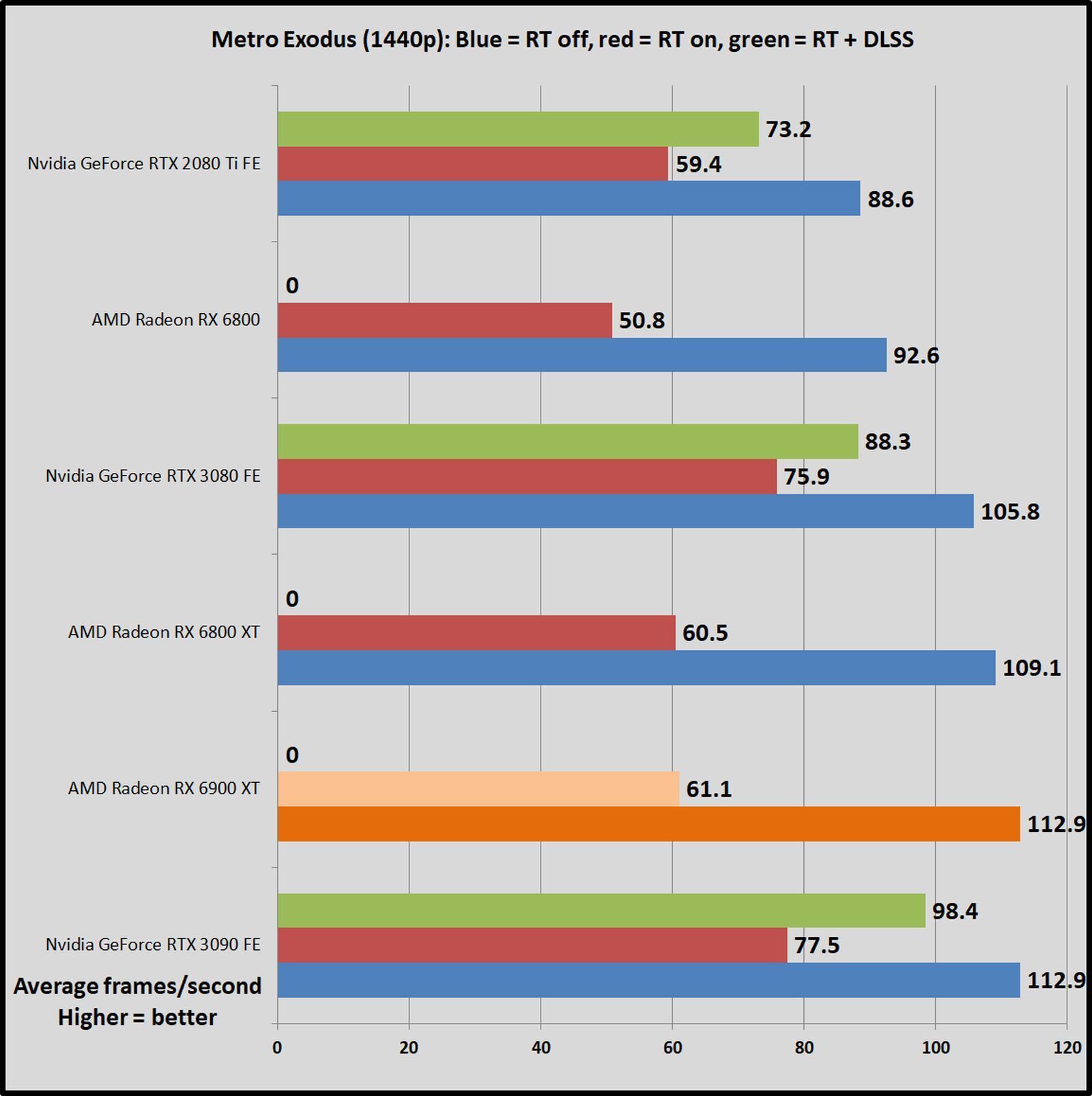 متأسفانه عدم وجود قابلیتی همانند DLSS انودیا در این کارت سبب شده تا اجرای بازیها با قابلیت RT تنها محدود به حداکثر رزولوشن 1440p شود. با فعالکردن فناوری RT در رزولوشن 4K، نرخ فریم بازیها به کمتر از 60 فریم در ثانیه کاهش مییابد که عملکرد مناسبی برای این کارت و این قیمت بهحساب نمیآید. ما برخی از بازیهایی که عملکرد نسبتاً بهتری داشتهاند را بررسی کردیم، در شماری از بازیها مانند Cyberpunk 2077 و Control که از محتوای گرافیکی بیشتری در زمینۀ Ray Tracing برخوردار هستند طبیعتاً نیاز است که دقت بیشتری به پارامترهایی که در تنظیمات گرافیکی فعال میکنید داشته باشید. در ادامه میتوانید نتایج بنچمارک مربوط به بازی Metro Exodus در دو رزولوشن 4K و 1440p را مشاهده کنید.
